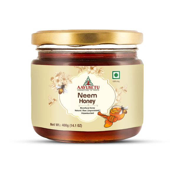Aayusetu Neem Honey is a dark honey, that has a rich natural taste. The distinctive essence of honey is typically warm and enveloping. Its exquisite taste will guide you to another dimension, infusing your body and soul with a yarn of wild sweetness and a burst of flavours. The honey is kept raw and unheated, preserving all the delicate enzymes and health-promoting qualities derived from the flower essences. It is largely used as a part of Ayurvedic treatments. Neem is considered panacea and having neem honey is a good way to consume it for daily health.