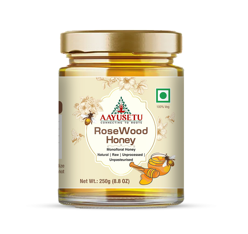 Aayusetu RoseWood Honey is obtained when beehive is placed in a Sheesham tree farm. Thus bees mainly collects nectar from Sheesham. Our Honey is Pure, Natural, Unpasteurized and minimally filtered retaining its natural properties. RoseWood honey is rich in vital amino acids that support a healthy lifestyle. RoseWood honey used for toothache and gum problems. It’s especially beneficial for women who have menstrual problems. It’s also used for good digestion and stomach ache. Rosewood Honey helps in blood pressure and improves blood circulation.